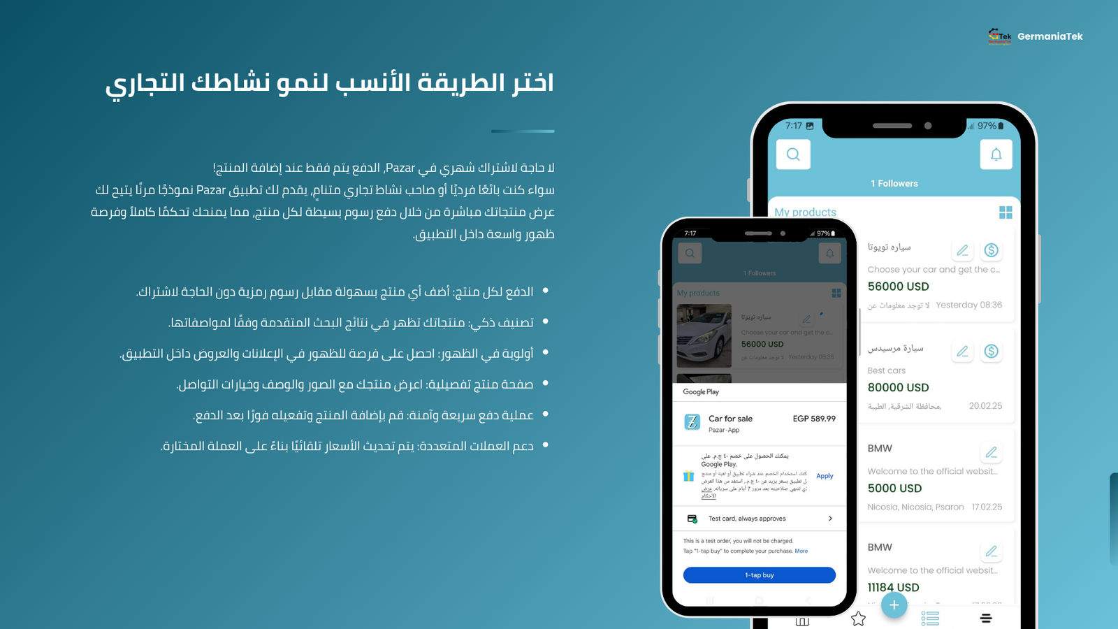 يتيح Pazar تجربة تسوق رقمية متكاملة من خلال تطبيق موبايل حديث، لوحة تحكم مرنة، وصفحة هبوط (Landing Page) مصممة لتحفيز الزوار وتحويلهم إلى عملاء فعليين.